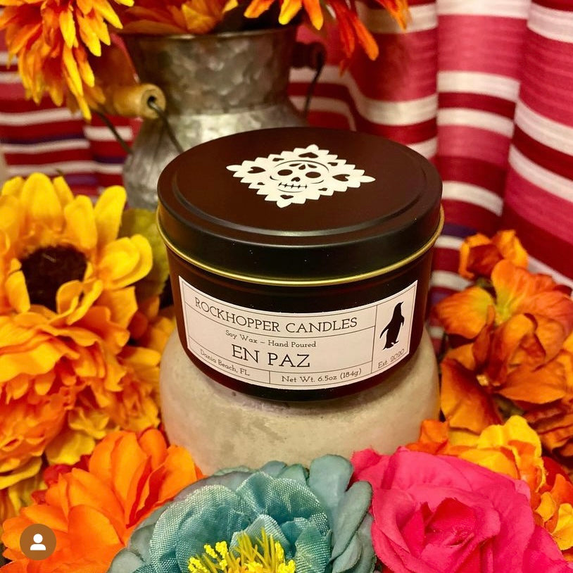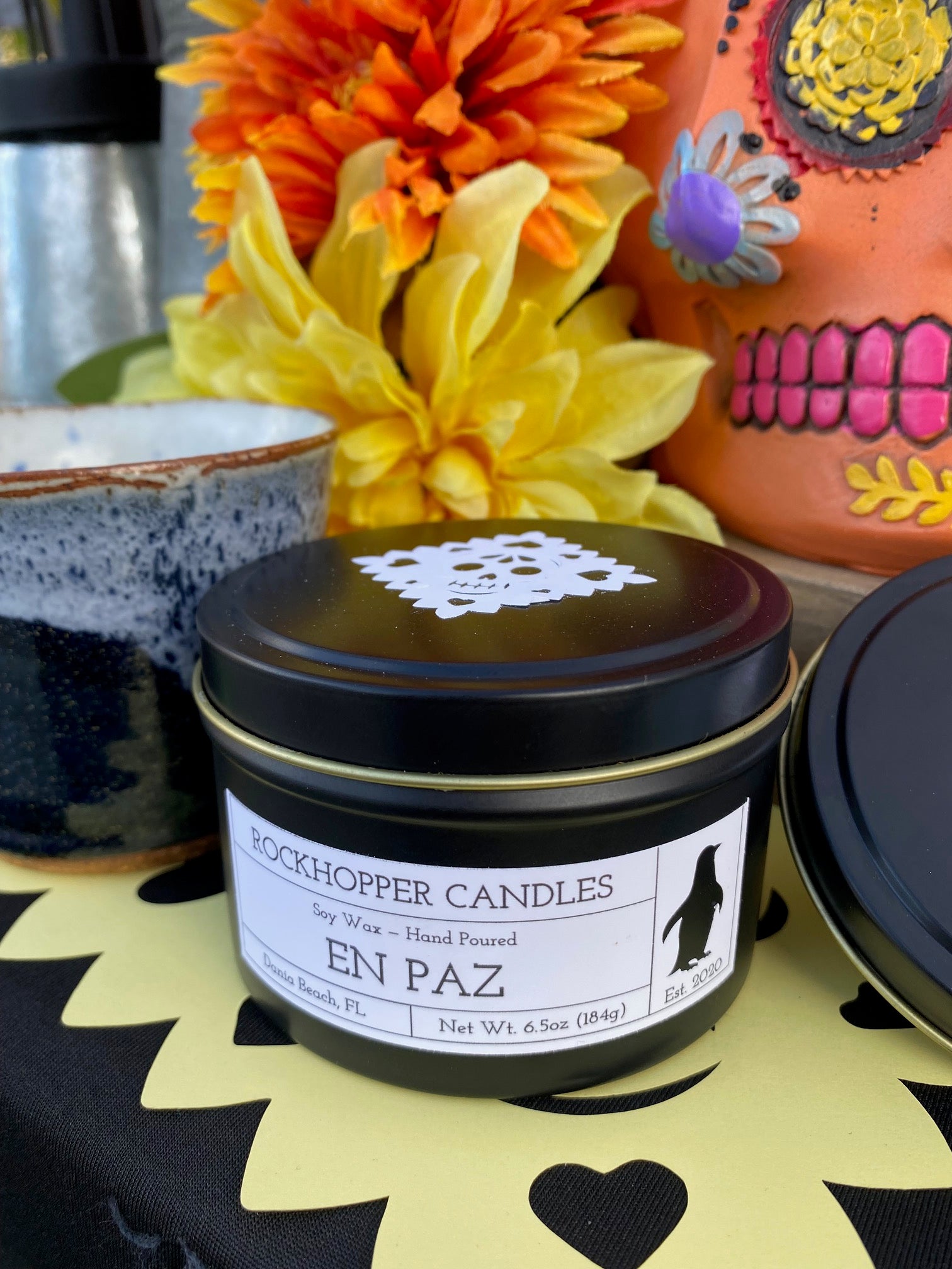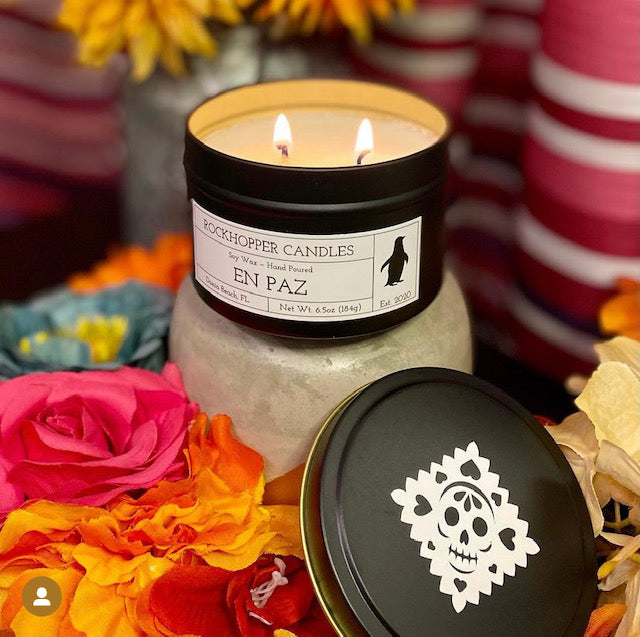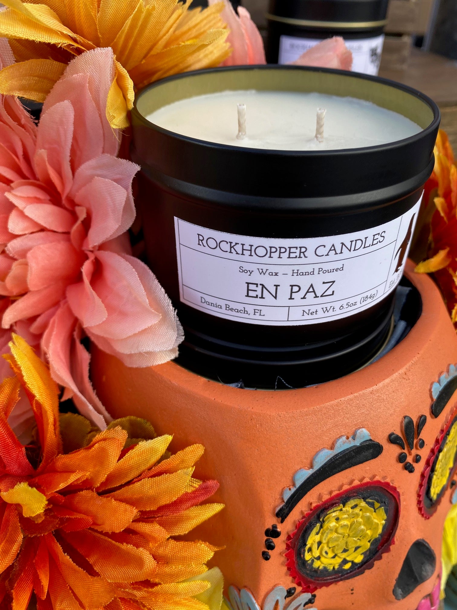 Honor the spirits with our limited edition En Paz candle, specialty crafted for Dia de los Muertos. Its peaceful scent infused with cedar and patchouli evokes remembrance and tranquility perfect for honoring your loved ones.